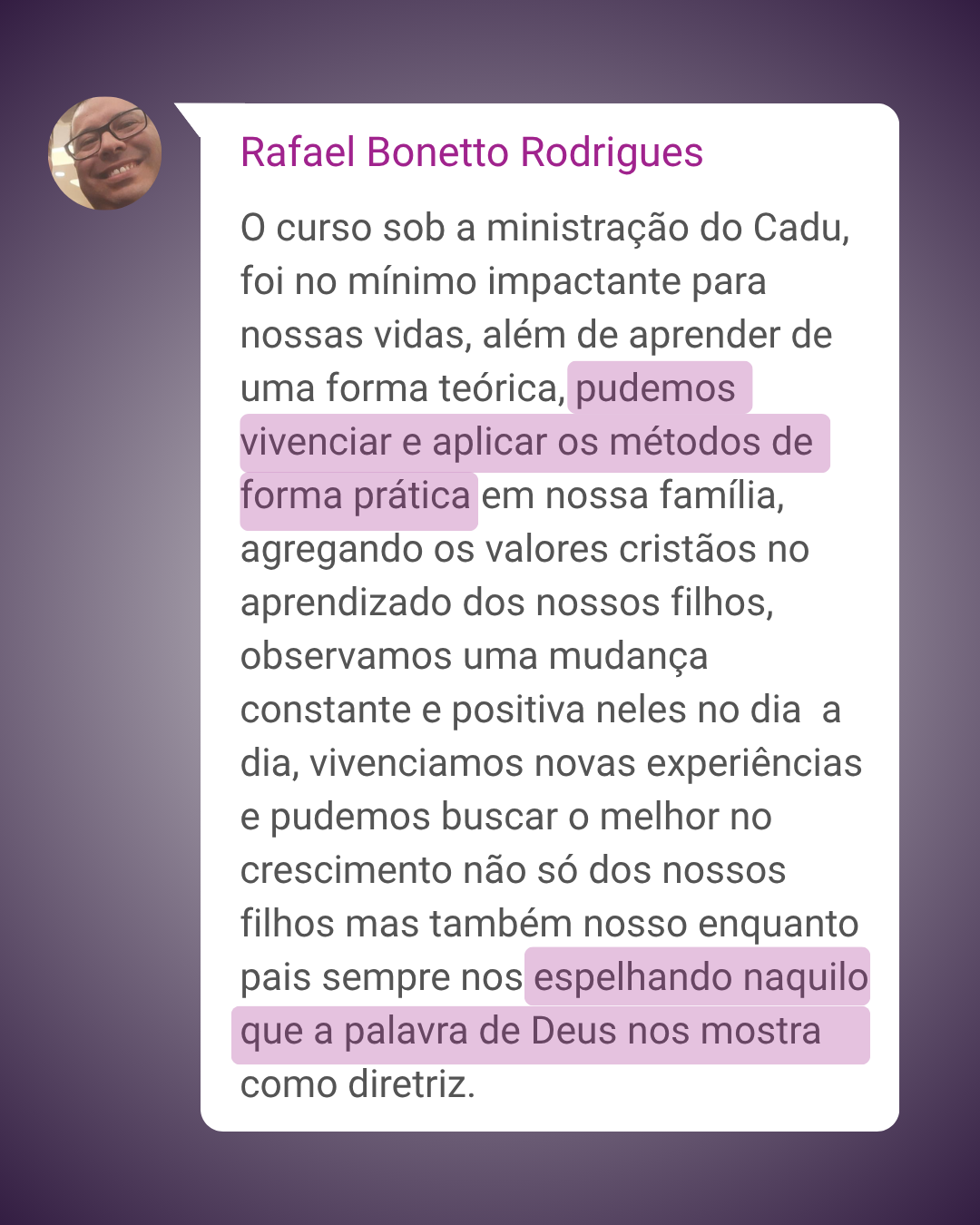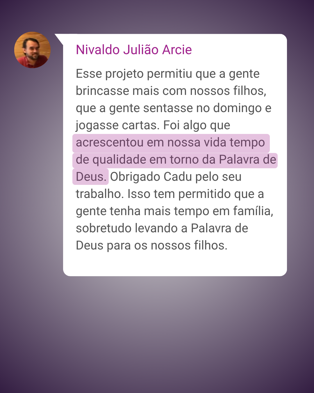 Cadu também tem outras experiências que contribuem para a Escola de Pais Cristãos. Ele foi docente nacional e Secretário Executivo do Instituto Haggai em SC, organização internacional dedicada ao desenvolvimento de líderes cristãos. É engenheiro e educador, com mais de 20 anos de experiência criando inovações tecnológicas para as áreas de Educação e Entretenimento. Atuou como diretor, roteirista e game designer em diferentes projetos de inovação tecnológica com games educativos para organizações como SEBRAE, SESI, SESC, UNESCO, MEC, Petrobras e outras. Fundador da Camino Studio, produtora de conteúdos educativos interativos para educação. Cadu usa essa experiência para criar games educativos e outras ferramentas para cultos domésticos que ele compartilha com as famílias da Escola de Pais Cristãos.