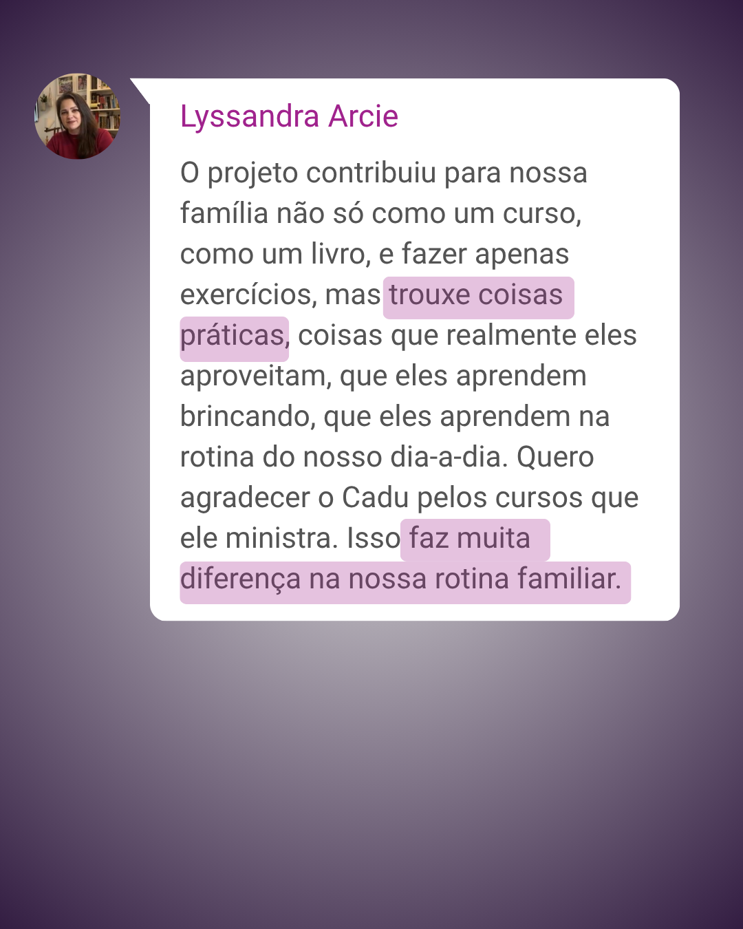 Participe de encontros periódicos para tirar dúvidas, conhecer estudos de caso e participar de palestras sobre diversos temas relacionados à educação de filhos. Suporte ao vivo de especialistas.