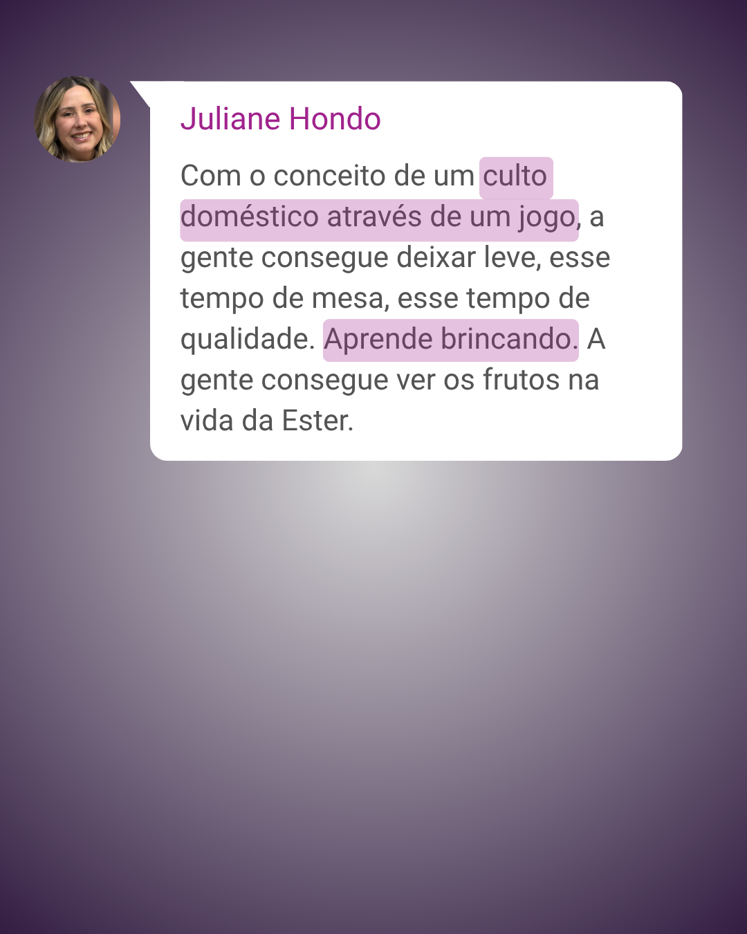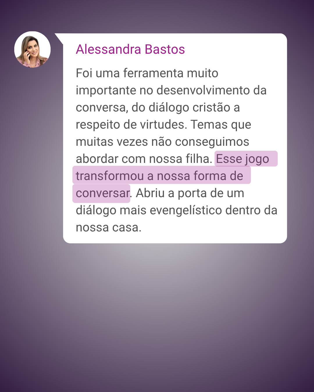 Um jogo de estratégia onde o objetivo é alcançar as virtudes de Jesus. As cartas representam atitudes virtuosas relacionadas a humildade, mansidão, generosidade, perseverança, e também têm cartas que representam pecados. A lógica do jogo ensina princípios bíblicos como a importância da vida devocional, o valor das boas amizades e o poder do arrependimento para se livrar dos pecados. Cada carta do jogo está associada a um estudo devocional online. Assim, os pais podem convidar seu filho para um momento de diversão, e ao final do jogo escolher uma das cartas para fazer um breve estudo devocional em família.
